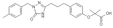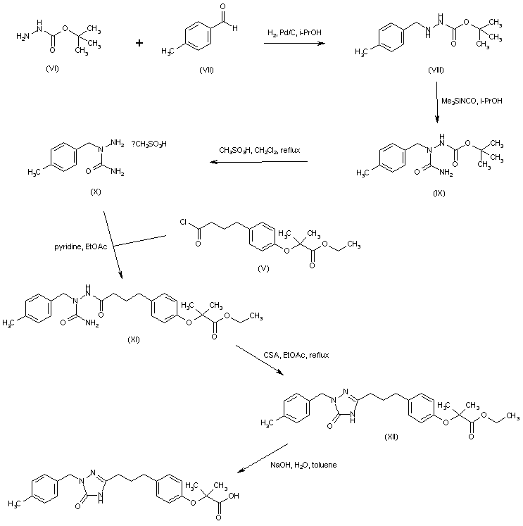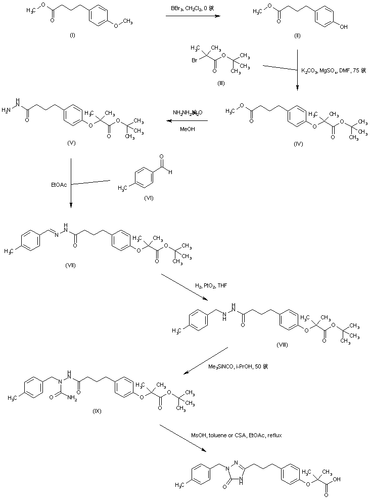 Demethylation of methyl 4-(4-methoxyphenyl)butyrate (I) using boron tribromide affords phenol (II). Subsequent alkylation of (II) with t-butyl 2-bromoisobutyrate (III) yields ether (IV). The methyl ester group of (IV) is then selectively displaced with hydrazine hydrate to form hydrazide (V). This is condensed with p-methylbenzaldehyde (VI) to give hydrazone (VII), which is further reduced to (VIII) by catalytic hydrogenation over PtO2. Reaction of acyl hydrazide (VIII) with trimethylsilyl isocyanate leads to the acyl semicarbazide (IX). Finally, simultaneous t-butyl ester cleavage and cyclization to the target triazolone is accomplished by treatment of (IX) with several different sulfonic acids.