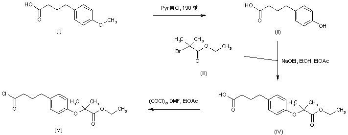 In an alternative method, 4-(4-methoxyphenyl)butyric acid (I) is demethylated to phenol (II) by heating at 190 C with pyridine hydrochloride. Alkylation of phenol (II) with ethyl 2-bromoisobutyrate (III) gives ether (IV). The carboxyl group of (IV) is then activated as the corresponding acid chloride (V) by treatment with oxalyl chloride in the presence of DMF.
