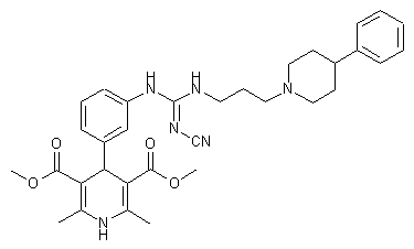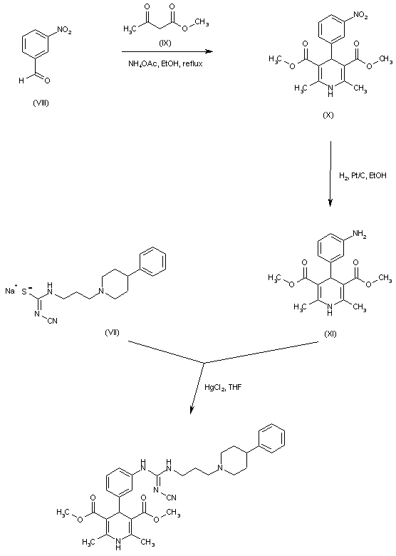 Condensation between 3-nitrobenzaldehyde (VIII) and methyl acetoacetate (IX) in the presence of ammonium acetate under Hantzsch reaction conditions leads to dihydropyridine (X). The nitro group of (X) is then reduced by catalytic hydrogenation to the corresponding aniline (XI). Finally, condensation of aniline (XI) with the cyanoisothiourea (VII) employing HgCl2 furnishes the target N-cyanoguanidine.