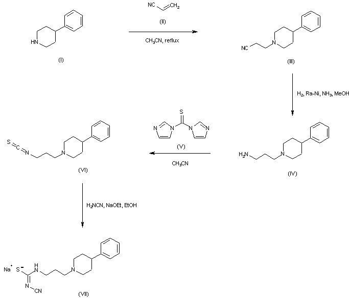 Conjugate addition of acrylonitrile (II) to 4-phenylpiperidine (I) affords the piperidinopropionitrile (III). Catalytic hydrogenation of the cyano group of (III) in the presence of Raney nickel and methanolic ammonia leads to diamine (IV). This is further converted into isothiocyanate (VI) by reaction with thiocarbonyl diimidazole (V). Subsequent addition of sodium cyanamide to isothiocyanate (VI) yields the intermediate N-cyano isothiourea sodium salt (VII).