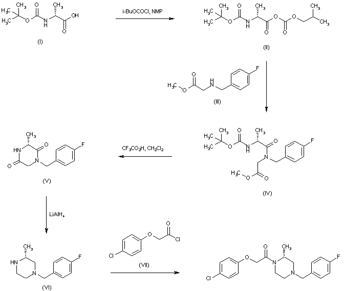 In an alternative procedure, N-Boc-D-alanine (I) is activated as the mixed anhydride (II) by treatment with isobutyl chloroformate. Coupling of anhydride (II) with N-(4-fluorobenzyl)glycine methyl ester (III) produces dipeptide (IV). Further cleavage of the N-Boc protecting group of (IV) under acidic conditions proceeds with concomitant cyclization to the diketopiperazine (V). This is then reduced by means of LiAlH4 to piperazine (VI). Finally, acylation of piperazine (VI) with (4-chlorophenoxy)acetyl chloride (VII) provides the title compound.
