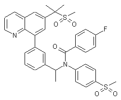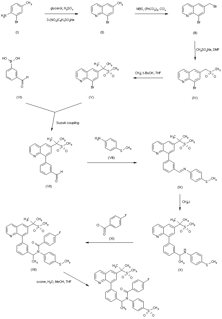 2-Bromo-4-methylaniline (I) is converted to quinoline (II) upon condensation with glycerol under Skraup synthesis conditions. Radical bromination of (II) with N-bromosuccinimide affords the benzylic bromide (III), which is subsequently displaced with sodium methanesulfinate to yield sulfone (IV). Alkylation of sulfone (IV) with iodomethane in the presence of potassium tert-butoxide affords the dimethylated sulfone (V). This is then subjected to Suzuki coupling with the boronic acid (VI) to produce the 8-aryl quinoline (VII). Condensation of aldehyde (VII) with 4-(methylthio)aniline (VIII) generates imine (IX), to which methyllithium is added to furnish the alpha methylated amine (X). Acylation of amine (X) by 4-fluorobenzoyl chloride (XI) gives amide (XII). The methylsulfanyl group of (XII) is finally oxidized with oxone to the target bis-sulfone derivative.