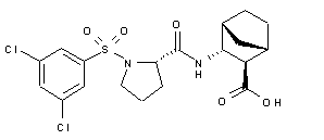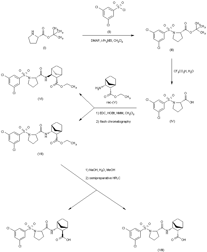 Acylation of L-proline t-butyl ester (I) with 3,5-dichlorobenzenesulfonyl chloride (II) affords sulfonamide (III). The tert-butyl ester group of (III) is then cleaved by treatment with aqueous trifluoroacetic acid, yielding carboxylic acid (IV). Coupling of sulfonyl proline (IV) with the racemic 3-endo-amino-bicyclo[2.2.1]heptane-2-endo-carboxylate (V) leads to a mixture of four diastereoisomeric amides, resulting from carboxylate group epimerization. This mixture can be separated into two pairs of diastereoisomers (VI) and (VII) by flash chromatography. The desired diastereoisomeric mixture of esters (VII) is then hydrolyzed under alkaline conditions to furnish the title carboxylic acid along with its epimer (VIII).