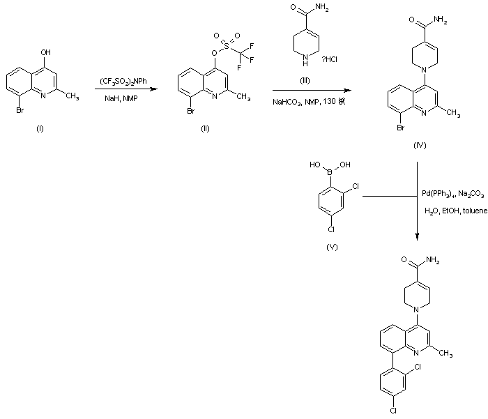 In a related synthetic strategy, 8-bromo-4-hydroxy-2-methylquinoline (I) is converted to aryl triflate (II) by using N-phenyl trifluoromethanesulfonimide and NaH. Displacement of the triflate group of (II) with 1,2,3,6-tetrahydropyridine-4-carboxamide (III) gives the tetrahydropyridyl quinoline (IV). The bromoquinoline (IV) is finally subjected to Suzuki coupling with 2,4-dichlorophenylboronic acid (V) to produce the title compound