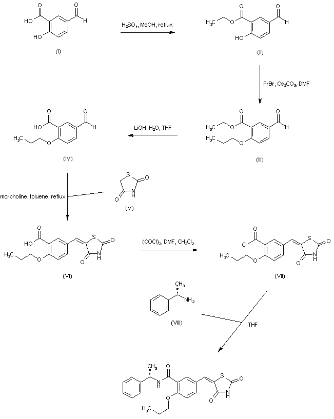 5-Formylsalicylic acid (I) is protected by esterification with H2SO4/MeOH to give the methyl ester (II). After alkylation of the phenolic hydroxyl group of (II) with propyl bromide, the resultant ortho-propoxy benzoate ester (III) is hydrolyzed to carboxylic acid (IV) with LiOH in aqueous THF. Condensation of the aldehyde-acid (IV) with 2,4-thiazolidinedione (V) in the presence of morpholine leads to the benzylidene thiazolidinedione (VI). Activation of the carboxyl group of (VI) with oxalyl chloride gives rise to the corresponding acid chloride (VII), which is then condensed with (S)-alpha-methylbenzylamine (VIII) to furnish the target amide.