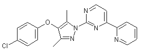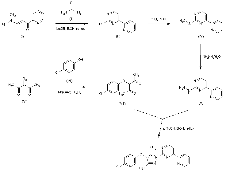 Condensation of the pyridyl enaminone (I) with thiourea (II) in the presence of NaOEt gives 2-mercapto-4-(pyridin-2-yl)pyrimidine (III), which is alkylated with iodomethane, producing the corresponding methylsulfanyl pyrimidine (IV). Subsequent displacement of the methylsulfanyl group of (IV) with hydrazine leads to the hydrazino pyrimidine (V). Rhodium acetate-catalyzed coupling between 3-diazo-2,4-pentanedione (VI) and 4-chlorophenol (VII) furnishes the chlorophenyl ether (VIII). The tile pyrazole derivative is finally obtained by condensation between hydrazine (V) and diketone (VIII) in the presence of p-toluenesulfonic acid in boiling EtOH.