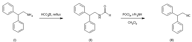 2,2-Diphenylethylamine (I) is converted into the corresponding formamide (II) upon refluxing in ethyl formate. Subsequent dehydration of formamide (II) with phosphorus oxychloride in the presence of diisopropylamine furnishes isocyanide (III)