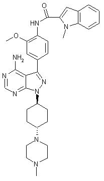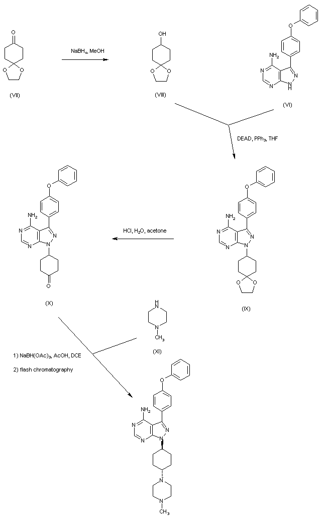 Treatment of 3-aminopyrazole-4-carbonitrile (I) with formamide at 180 C gives rise to the pyrazolopyrimidinyl amine (II). Subsequent iodination of (II) with N-iodosuccinimide in hot DMF affords 3-iodo-1H-pyrazolo[3,4-d]pyrimidin-4-ylamine (III). Reduction of 1,4-cyclohexanedione mono-ethylene ketal (IV) with NaBH4 furnishes alcohol (V). This is then subjected to Mitsunobu coupling with the pyrazolopyrimidine (III) to produce adduct (VI). Acidic hydrolysis of the ethylene ketal (VI) leads to the cyclohexanone (VII). The reductive amination of ketone (VII) with N-methylpiperazine (VIII), either employing NaBH(OAc)3 or via condensation in hot NMP, and then reduction of the resultant enamine with formic acid, produces a mixture of trans- (IX) and cis- (X) disubstituted cyclohexanes, with different ratios in each case.