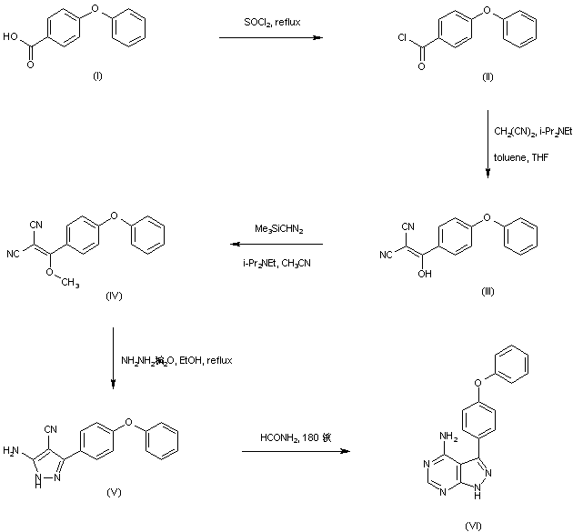 4-Phenoxybenzoic acid (I) is chlorinated with SOCl2, and the resultant acid chloride (II) is then condensed with malononitrile to produce the hydroxybenzylidene malononitrile (III). Subsequent methylation of (III) with trimethylsilyl diazomethane yields the methyl ether (IV), which is cyclized to pyrazole (V) upon treatment with hydrazine hydrate in boiling EtOH. Reaction of the 3-amino-4-cyanopyrazole (V) with hot formamide then produces the key pyrazolopyrimidine intermediate (VI).