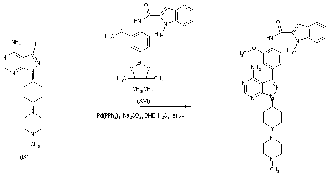 In a related procedure, the pyrazolopyrimidinyl iodide (IX) is coupled to the (indolecarboxamido)phenyl boronate (XVI) under Suzuki reaction conditions, leading directly to the title compound.