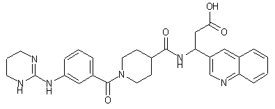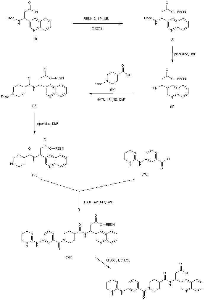 | 合成路线图解说明: The title compound is obtained by solid-phase synthesis using a 2-chlorotrityl chloride resin: Attachment of N-Fmoc-3-amino-3-(3-quinolinyl)propionic acid (I) to the chlorotrityl resin provides the protected amino acid-bound resin (II). Removal of the N-Fmoc group of (II) is achieved by treatment with piperidine in DMF to yield (III). Acylation of amine (III) with N-Fmoc-isonipecotic acid (IV) employing HATU furnishes amide (V). After Fmoc group deprotection in (V) with piperidine, the resultant amine resin (VI) is coupled to the guanidino acid (VII), producing resin (VIII). The title compound is finally cleaved from the resin by treatment with trifluoroacetic acid. |