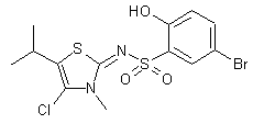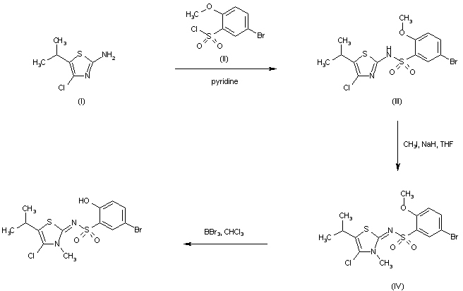 Acylation of 2-amino-4-chloro-5-isopropylthiazole (I) with 5-bromo-2-methoxybenzenesulfonyl chloride (II) yields sulfonamide (III). Methylation of (III) with ICH3/NaH takes place at the thiazole N, producing (IV). Finally, methyl ether cleavage in (IV) by means of BBr3 in cold CHCl3 affords the title compound.