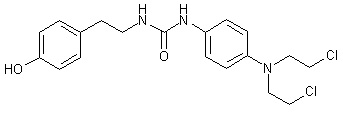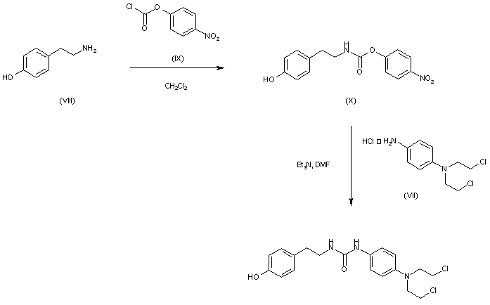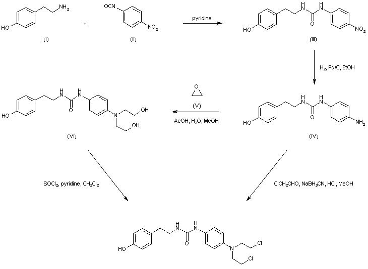 Coupling of tyramine (I) with p-nitrophenyl isocyanate (II) affords urea (III). Subsequent nitro group reduction with H2 and Pd/C gives amine (IV). Condensation of amine (IV) with ethylene oxide (V) leads to the bis-hydroxyethyl amine (VI). This is finally chlorinated employing SOCl2 in pyridine. Alternatively, amine (IV) is subjected to reductive alkylation with chloroacetaldehyde and NaBH3CN to furnish the target bis-chloroethyl amine. (1,2)