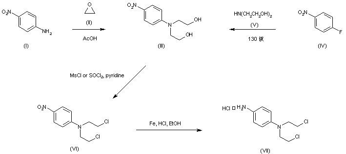 In an alternative method, p-nitroaniline (I) is reacted with ethylene oxide (II) to afford diol (III). This compound can also be prepared by condensation of 1-fluoro-4-nitrobenzene (IV) with diethanolamine (V). Chlorination of diol (III) to provide (VI) is accomplished with either mesyl chloride or SOCl2 in the presence of pyridine. Then, nitro group reduction in (VI) by means of iron and HCl affords aniline (VII).