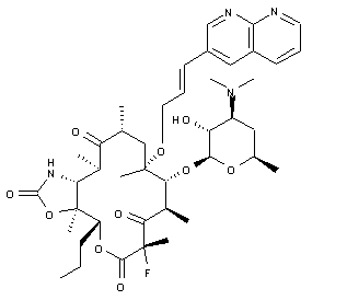Elimination of the mesylate group of (XXIII) utilizing DBU in acetone leads to the 10,11-anhydro ketolide (XXIV). Acylation of (XXIV) with carbonyl diimidazole and NaH, followed by treatment with ammonium hydroxide gives rise to the 11,12-cyclic carbamate (XXV). Subsequent Heck coupling of allyl ether (XXV) with 3-bromo-1,8-naphthyridine (XXVI) leads to the (naphthyridinyl)propenyl derivative (XXVII). Then, fluorination of (XXVII) with N-fluorobenzenesulfonimide furnishes the 2-fluoro ketolide (XXVIII). Finally, the benzoate ester group of (XXVIII) is removed in refluxing MeOH to provide the title compound.