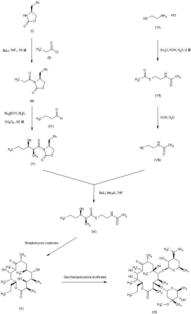 Preparation of the 15-methylerythromycin A precursor (XI) is accomplished by a chemobiosynthetic approach, utilizing the diketide surrogate (IX). Synthesis of (IX) is carried out as follows. Acylation of (S)-4-benzyl-2-oxazolidinone (I) with propionyl chloride (II) affords the N-propionyl oxazolidinone (III). Diastereoselective aldol condensation of (III) with butyraldehyde (IV) employing dibutylboron triflate leads to adduct (V). Deacetylation of cysteamine hydrochloride (VI) with Ac2O provides (VII). Then, selective hydrolysis of the thioester function of (VII) under alkaline conditions provides thiol (VIII). Condensation of the acyl oxazolidinone (V) with thiol (VIII) in the presence of AlMe3 gives rise to the thioester substrate (IX) (1). Incubation of a recombinant Streptomyces coelicolor strain with the diketide surrogate (IX) leads to the production of 6-deoxy-15-methylerythronolide B (X). Subsequent bioconversion of the aglycone (X) in a Saccharopolyspora erythraea strain affords the desired 15-methylerythromycin A (XI).