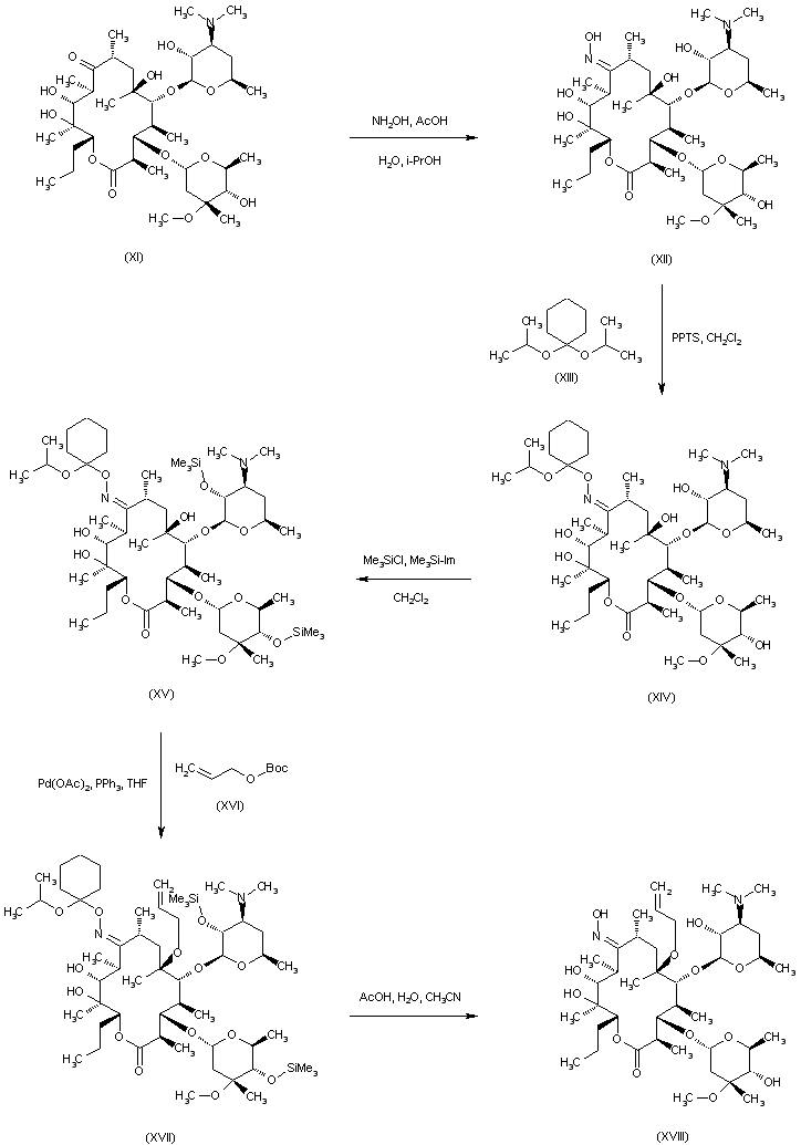 The obtained 15 methylerythromycin A (XI) is chemically modified as follows. Treatment of ketone (XI) with hydroxylamine and AcOH provides oxime (XII), which is further converted into oxime acetal (XIV) by condensation with 1,1-diisopropoxycyclohexane (XIII) in the presence of PPTS. The sugar hydroxyl groups of (XIV) are then protected by silylation with trimethylsilyl chloride/trimethylsilyl imidazole to yield the 2',4''-bis-silyl ether (XV). Then, alkylation of the 6-hydroxyl group of (XV) with allyl t-butyl carbonate (XVI) in the presence of Pd(OAc)2 provides allyl ether (XVII). Further acidic hydrolysis of the acetal and silyl ether groups of (XVII) affords oxime (XVIII).