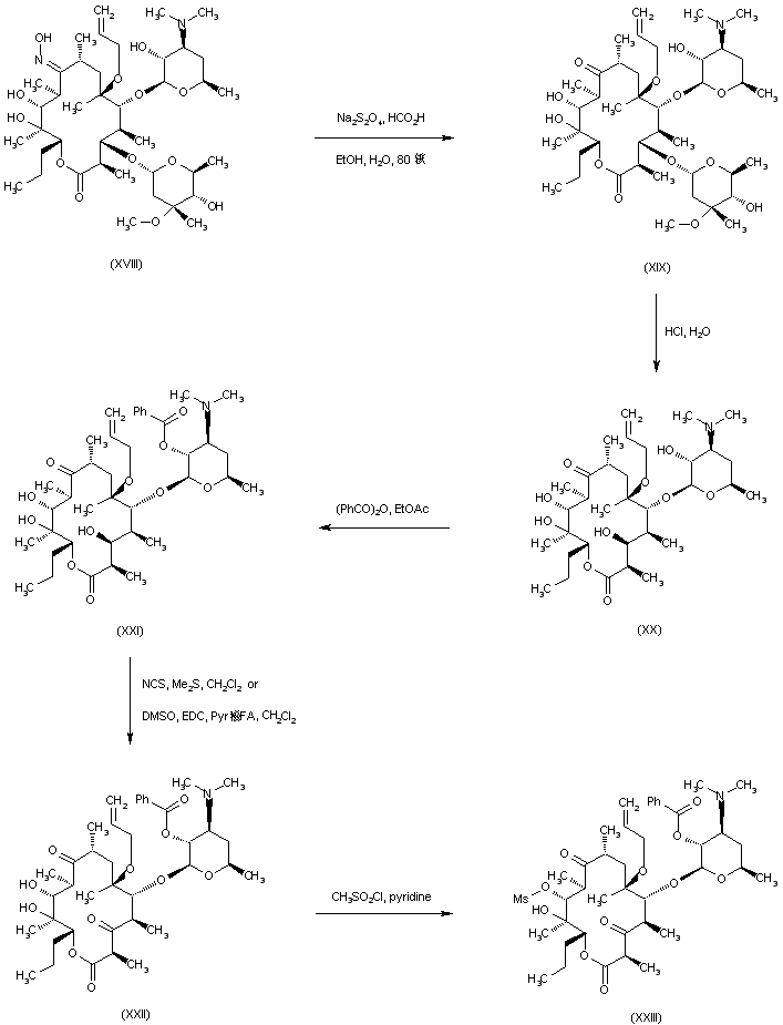 Removal of the oxime functionality of (XVIII) by means of sodium hydrosulfite and formic acid gives ketone (XIX). The C-3 sugar moiety is then cleaved under smooth acidic hydrolysis conditions yielding the des-cladinose analogue (XX). After protection of the 2'-hydroxyl group of the desosamine moiety of (XX) as the benzoate ester (XXI), its 3-hydroxyl is oxidized with either NCS/Me2S or with DMSO/EDC, producing the ketolide derivative (XXII). The C-11 secondary hydroxyl of (XXII) is then converted to mesylate (XXIII) by treatment with methanesulfonyl chloride in pyridine.
