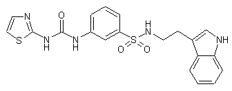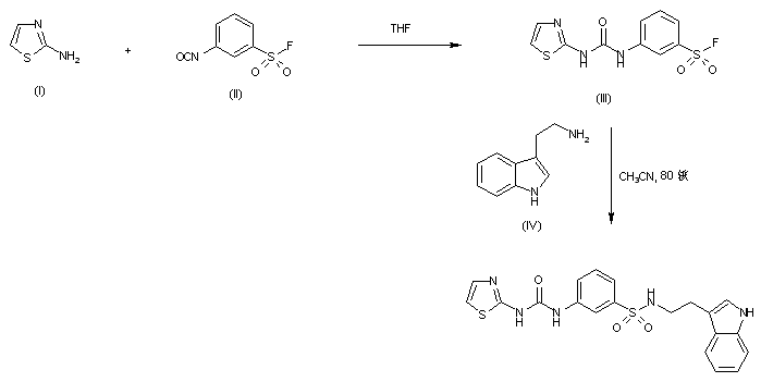 2-Aminothiazole (I) is coupled to 3-fluorosulfonylphenyl isocyanate (II) producing the diaryl urea (III). Subsequent reaction of sulfonyl fluoride (III) with tryptamine (IV) in hot acetonitrile furnishes the target sulfonamide.