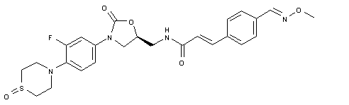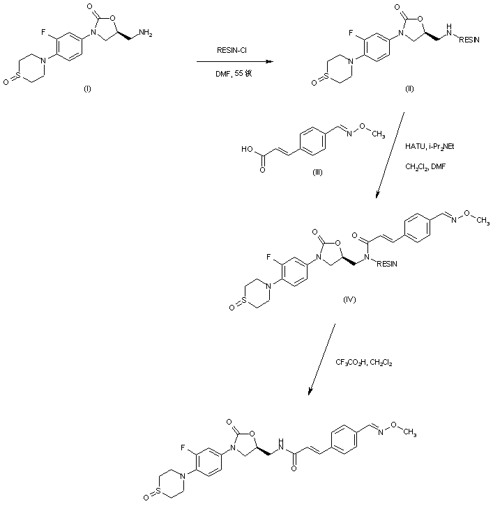 The title compound is prepared by solid phase synthesis utilizing a chloro-derivatized Sasrin resin. Coupling of aminomethyl oxazolidinone (I) to the chloromethyl resin affords the amine bound resin (II). This is then acylated with the cinnamic acid derivative (III) by means of HATU to furnish the corresponding amide (IV). Finally, cleavage of the target amide from resin (IV) is effected by treatment with 10% trifluoroacetic acid in CH2Cl2.
