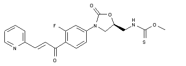 3-Fluoroaniline (I) is condensed with benzyl chloroformate to give carbamate (II). Reaction of (II) with (R)-glycidol butyrate (III) in the presence of butyllithium affords oxazolidinone (IV). After conversion of alcohol (IV) to the corresponding mesylate, displacement with NaN3 provides azide (V). Reduction and acylation of (V) by means of thioacetic acid leads to acetamide (VI). Friedel-Crafts acylation of the aromatic ring of (VI) with acetic anhydride in the presence of methanesulfonic acid furnishes acetophenone (VII). Acidic hydrolysis of acetamide (VII) yields amine (VIII). This is then treated with thiophosgene, followed by methanol, to produce the thiocarbamate (IX). Finally, aldol condensation of the acetophenone (IX) with pyridine-2-carbaldehyde (X) gives rise to the target compound.