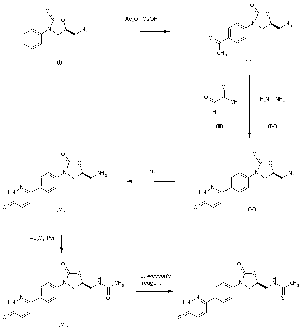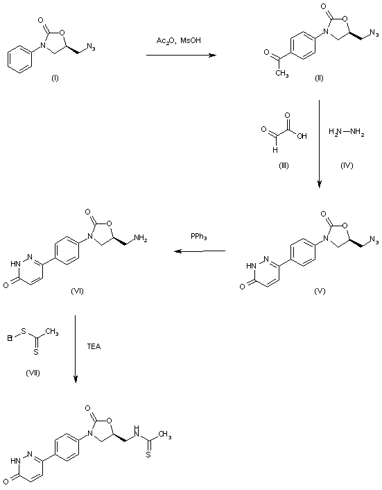 The reaction of 5(R)-(azidomethyl)-3-phenyloxazolidin-2-one (I) with Ac2O and MsOH gives the 4-acetylphenyl derivative (II), which is cyclized with glyoxylic acid (III) and hydrazine (IV) in hot acetic acid to yield the pyridazinone derivative (V). The reduction of the azido group of (V) by means of PPh3 in THF/water affords the aminomethyl compound (VI), which is finally condensed with ethyl dithioacetate (VII) by means of TEA in DMF to provide the target thioacetamide.