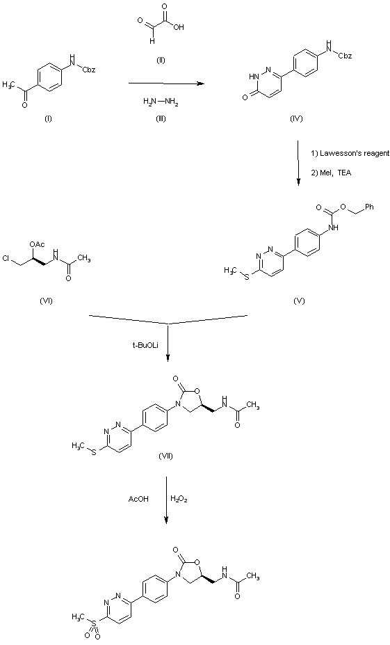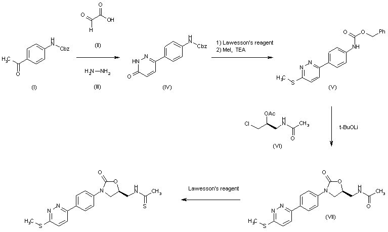The cyclization of 4-(benzyloxycarbonylamino)acetophenone (I) with glyoxylic acid (II) and hydrazine (III) in hot acetic acid gives the pyridazinone (IV), which is treated first with Lawesson's reagent in hot dioxane and then with MeI and TEA in DMF to yield the methylsulfanyl pyridazine (V). The cyclization of (V) with acetamide (VI) by means of t-BuOLi in methanol/DMF affords the oxazolidinone (VII), which is finally treated with Lawesson's reagent in hot dioxane to provide the target thioacetamide.