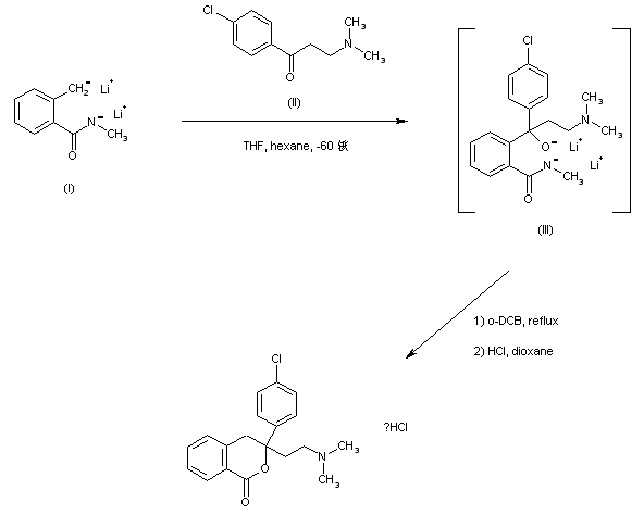 Addition of the dilithium salt of N-methyl-o-toluamide (I) to 4-chloro-3'-(dimethylamino)propiophenone (II) produces intermediate (III). Cyclization of (III) in refluxing o-dichlorobenzene generates the target isobenzochromanone compound, which is finally isolated as the corresponding hydrochloride salt