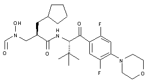 Condensation of N-Boc-tert-leucine pentafluorophenyl ester (I) with Grignard reagent (II) furnishes the trifluorophenyl ketone (III). After acidic N-Boc group cleavage in (III), the resultant amine (IV) is coupled with the N-formyl-N-(benzyloxy)aminoacid (V) to provide the corresponding amide (VI). Displacement of the 4-fluoro group of (VI) with morpholine (VII) gives rise to the morpholinophenyl ketone (VIII). The O-benzyl protecting group of (VIII) is finally removed by transfer hydrogenolysis in the presence of cyclohexene and Pd/C to afford the target hydroxylamine compound (1).