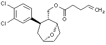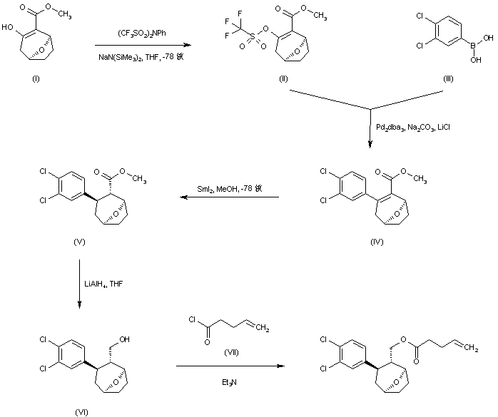 Treatment of methyl 3-hydroxy-8-oxabicyclo[3.2.1]oct-2-ene-2-carboxylate (I) with N-phenyl trifluoromethanesulfonimide leads to the vinyl triflate (II). Suzuki coupling of triflate (II) with 3,4-dichlorophenylboronic acid (III) furnishes the oxabicyclooctene adduct (IV), which is further reduced to the oxabicyclooctane (V) with SmI2. Ester reduction in (V) with LiAlH4 provides alcohol (VI). This is finally esterified with 4-pentenoyl chloride (VII) to furnish the title compound.