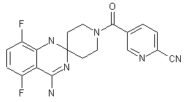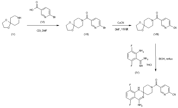 4-Piperidone ethylene ketal (V) is acylated with 6-bromonicotinic acid (VI) employing 1,1'-carbonyldiimidazole to yield amide (VII). The bromide group of (VII) is then displaced with CuCN in hot DMF producing nitrile (VIII). Finally, condensation between N-acylpiperidone (VIII) and amidine (IV) in refluxing EtOH leads to the target spiro quinazoline.