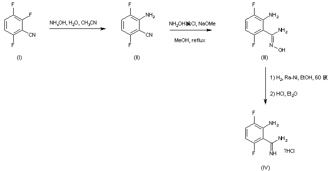 Displacement of the 2-fluoro group in 2,3,6-trifluorobenzonitrile (I) with aqueous ammonia leads to 2-amino-3,6-difluorobenzonitrile (II). Addition of hydroxylamine to the nitrile (II) in the presence of NaOMe affords benzamidoxime (III). Subsequent catalytic hydrogenation of (III) over Raney nickel furnishes benzamidine (IV).