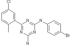 The cyclization of 1-(4-bromophenyl)biguanide (I) with 5-chloro-2-methyl benzoic acid methyl ester (II) by means of NaOEt in refluxing ethanol gives the target triazine derivative.
