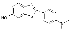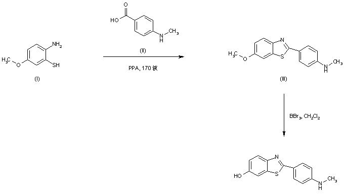 Condensation of 2-amino-5-methoxythiophenol (I) with 4-(methylamino)benzoic acid (II) in hot polyphosphoric acid produces the benzothiazole derivative (III), which is finally submitted to methyl ether cleavage by means of BBr3 to give the target hydroxy compound.