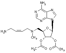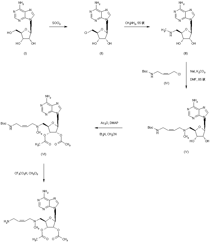 The primary hydroxyl group of adenosine (I) is chlorinated by means of SOCl2 to afford chloride (II), which is then displaced by methylamine at 55 C in a pressure vessel to furnish amine (III). Subsequent alkylation of (III) with the allyl chloride (IV) in hot DMF provides (V). After esterification of diol (V) with acetic anhydride, the resultant diacetate (VI) is subjected to acid-catalyzed N-Boc group cleavage to furnish the title compound.