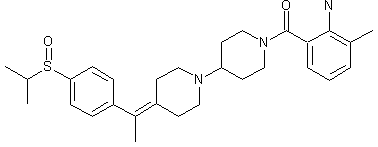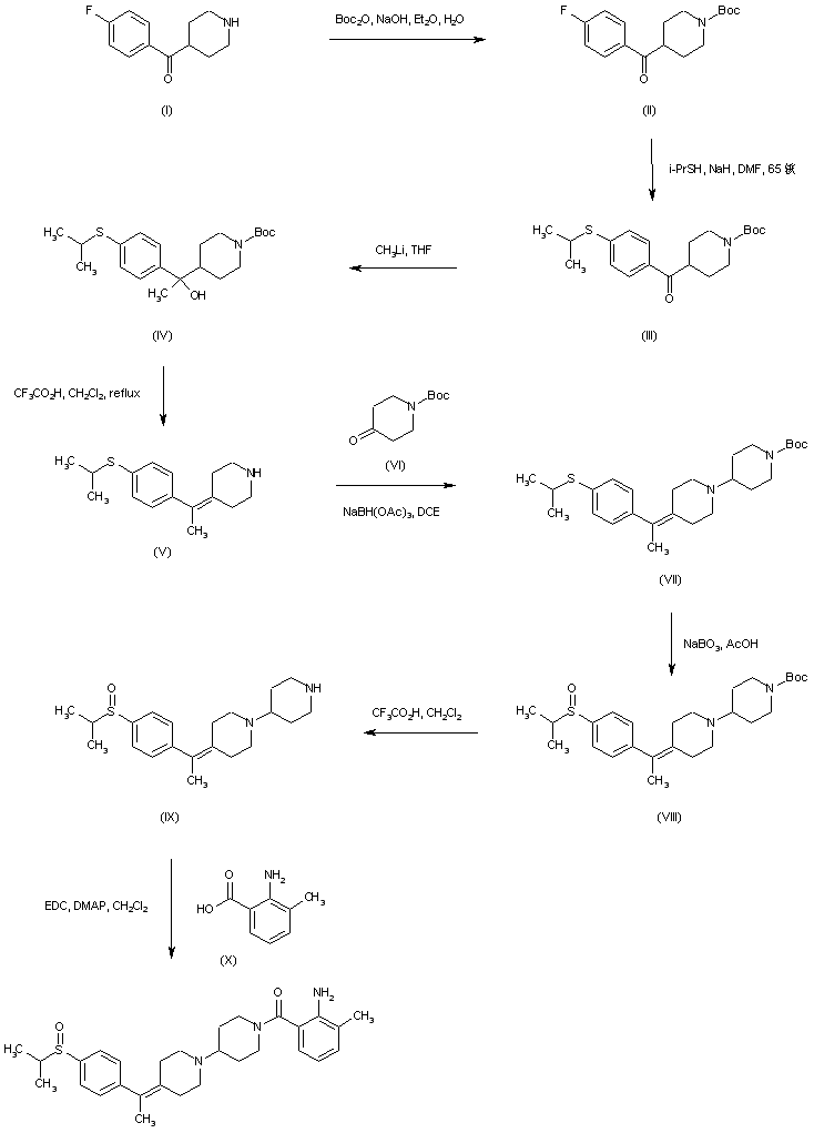 Protection of 4-(4-fluorobenzoyl)piperidine (I) as the tert-butyl carbamate (II), followed by displacement of the fluorine atom with isopropylthiol affords the isopropylsulfanyl derivative (III). Subsequent addition of methyllithium to ketone (III) produces the tertiary alcohol (IV). Dehydration of alcohol (IV) with concomitant N-Boc group cleavage under acidic conditions gives rise to the benzylidene piperidine (V), which is further subjected to reductive alkylation with N-Boc-4-piperidone (VI) in the presence of NaBH(OAc)3 to yield the bipiperidine derivative (VII). Controlled oxidation of the sulfide group of (VII) employing NaBO3/AcOH provides sulfoxide (VIII). After N-Boc group cleavage in (VIII) by means of trifluoroacetic acid, the resultant amine (IX) is coupled to 3 methylanthranilic acid (X) to furnish the target amide.