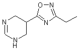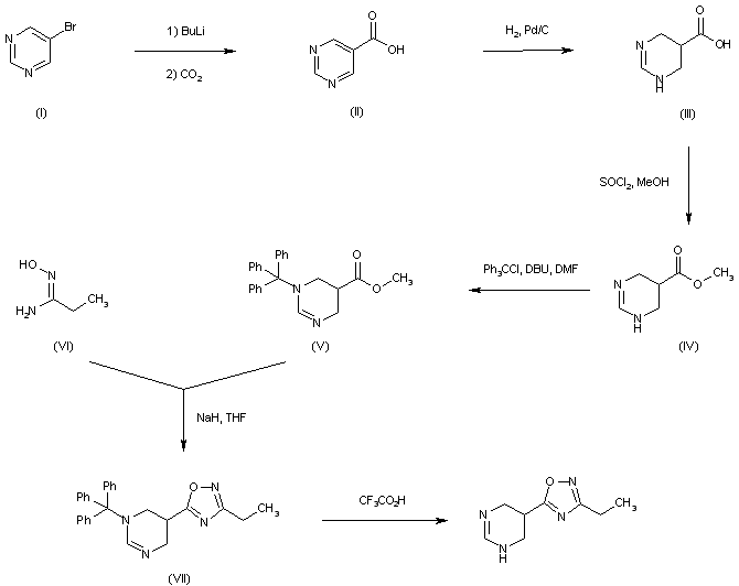 Lithiation of 5-bromopyrimidine (I), followed by addition of CO2 produces pyrimidine-5-carboxylic acid (II). After catalytic hydrogenation of (II), the resultant tetrahydropyrimidine acid (III) is esterified with SOCl2 in MeOH to yield the corresponding methyl ester (IV). Protection of (IV) with triphenylmethyl chloride and DBU affords the N-trityl derivative (V). Then, condensation between the sodium derivative of propionamide oxime (VI) and ester (V) gives rise to the oxadiazole compound (VII). The N-trityl group of (VII) is finally removed with trifluoroacetic acid to furnish the title compound.