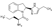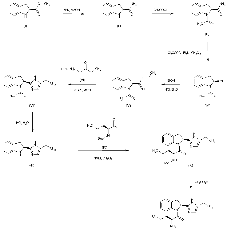 Ethyl (S)-indoline-2-carboxylate (I) is treated with methanolic ammonia to yield amide (II). After protection of indoline (II) as the N-acetyl derivative (III), dehydration of the carboxamide moiety by means of trichloroacetyl chloride and triethylamine leads to nitrile (IV). Subsequent treatment of nitrile (IV) with ethanolic HCl affords imidate (V), which is further condensed with 1-amino-2-butanone (VI) producing imidazole (VII). Deacetylation of (VII) in refluxing 6 N HCl, followed by coupling of the resultant amine (VIII) with acid fluoride (IX) yields amide (X). Finally, N-Boc group cleavage in (X) by means of trifluoroacetic acid furnishes the title compound.