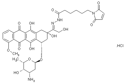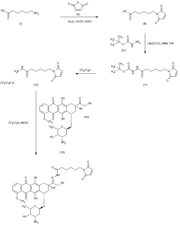 6-Aminocaproic acid (I) is condensed with maleic anhydride (II) in refluxing AcOH to provide maleimidocaproic acid (III). After activation of acid (III) as the corresponding mixed anhydride with isobutyl chloroformate, coupling with tert-butyl carbazate (IV) affords the N-Boc hydrazide (V). Subsequent acidic cleavage of the Boc group of (V) furnishes hydrazide (VI). Finally, hydrazide (VI) is condensed with doxorubicin (VII) to produce the title hydrazone conjugate.