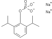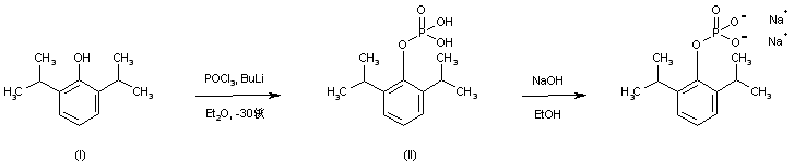 The lithium phenoxide obtained from propofol (I) and butyllithium is condensed with phosphoryl chloride to produce, after aqueous work up, the phosphate ester (II). Subsequent neutralization of an ethanolic solution of (II) with 1 M NaOH gives rise to the corresponding disodium salt.