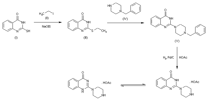 | 合成路线图解说明: The ethanolysis of 1-benzylpyrrolidin-2-one (I) with HCl in ethanol gives 4-(benzylamino)butyric acid ethyl ester (II), which is alkylated with ethyl bromoacetate (III), yielding the tertiary amine (IV). The cyclization of (IV) by means of sodium ethoxide affords 1-benzyl-3-hydroxy-1,2,5,6-tetrahydropyridine-4-carboxylic acid ethyl ester (V), which by hydrogenolytic debenzylation, followed by reaction with methyl chloroformate (VI), affords the 1,4-dicarboxylate (VII). The reaction of (VII) with ethyleneglycol (VIII) and TsOH gives the cyclic ketal (IX), which is treated with hydroxylamine and NaOMe to yield the carbohydroxamic acid (X). The cyclization of (X) by means of H2SO4 affords 3-hydroxy-4,5,6,7-tetrahydropyrido[4,3-d]oxazole-6-carboxylic acid methyl ester (XI), which is finally decarboxylated by means of HBr and TEA. |