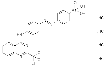 2-(Trichloromethyl)quinazolin-4-one (I) is chlorinated with oxalyl chloride in the presence of DMF producing 4-chloro-2-(trichloromethyl)quinazoline (II). Subsequent coupling of chloroquinazoline (II) with 4-(4'-aminophenylazo)phenylarsonic acid (III) in refluxing isopropanol furnishes the title compound. (1,2)