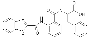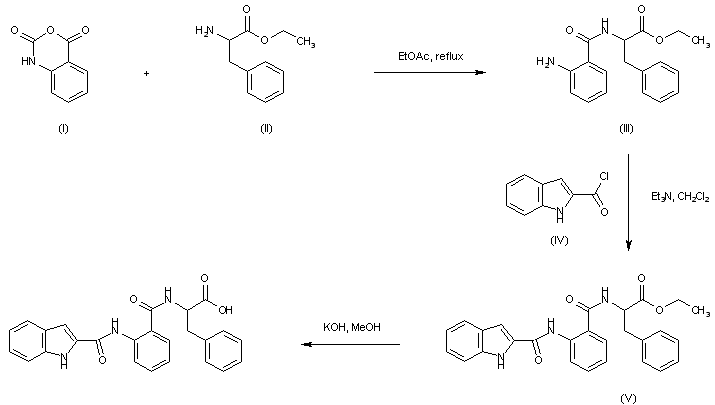 Condensation of isatoic anhydride (I) with DL-phenylalanine ethyl ester (II) affords anthranilamide (III). Subsequent acylation of amino amide (III) with indole-2-carbonyl chloride (IV) provides diamide (V). The ethyl ester group of (V) is finally hydrolyzed to the target carboxylic acid with methanolic KOH