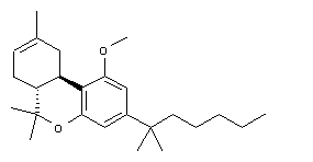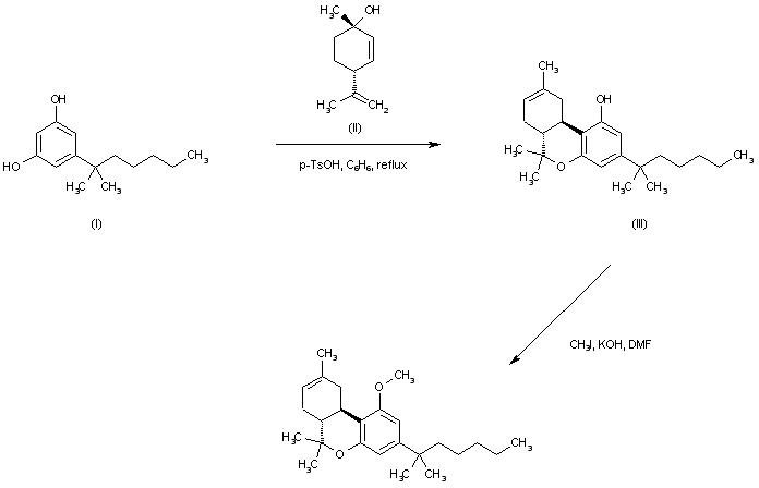 Condensation of 5-(1,1-dimethylhexyl)resorcinol (I) with (1S,4R)-4-isopropenyl-1-methyl-2-cyclohexenol (II) under acidic conditions furnishes the tetrahydrocannabinol derivative (III). The phenolic hydroxyl of (III) is then alkylated by iodomethane in the presence of NaOH to afford the target methyl ether.