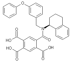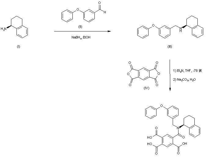 The reductive alkylation of (S)-1,2,3,4-tetrahydro-1-naphthalenylamine (I) with 3-phenoxybenzaldehyde (II) in the presence of NaBH4 affords the secondary amine (III), which is then acylated with 1,2,4,5-benzenetetracarboxylic dianhydride (IV), followed by aqueous hydrolysis to furnish the title compound.