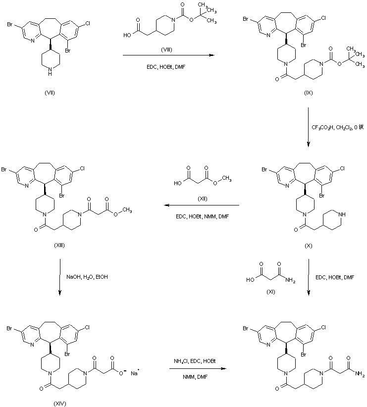 Amine (VII) is coupled to N-Boc-4-piperidineacetic acid (VIII) by means of EDC/HOBt to afford amide (IX). Subsequent acidic cleavage of the N-Boc group of (IX) leads to amine (X) (1,2). Piperidine (X) is finally coupled with malonic acid mono-amide (XI) to furnish the title compound (1,2). In a related method, piperidine (X) is coupled to mono-methyl malonate (XII), yielding the amide ester (XIII). Basic hydrolysis of the methyl ester group of (XIII) then leads to the sodium carboxylate salt (XIV), which is finally reacted with ammonium chloride in the presence of EDC/HOBt to produce the target amide (3).