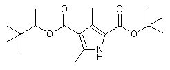 Nitrosation of tert-butyl acetoacetate (I) with NaNO2 in cold AcOH leads to oxime (II), which is further condensed with benzyl acetoacetate (III) in the presence of Zn and ammonium acetate, to produce pyrrole (IV). The 4-benzyl ester of (IV) is selectively removed by catalytic hydrogenolysis over Pd/C, yielding the pyrrole-4-carboxylic acid (V). Subsequent coupling of acid (V) with 3,3-dimethyl-2-butanol (VI) employing trifluoroacetic anhydride furnishes the target pyrrole diester.