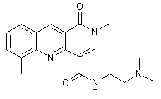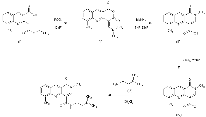 Reaction of ethyl (3-carboxy-8-methylquinolin-2-yl)acetate (I) with POCl3/DMF under Vilsmeier formylation conditions leads to the cyclic anhydride (II). Subsequent treatment of (II) with methylamine gives rise to the benzonaphthyridine derivative (III). After activation of acid (III) as the corresponding acyl chloride (IV) with SOCl2, condensation with N,N-dimethyl ethylenediamine (V) furnishes the title amide.