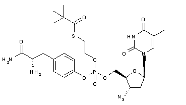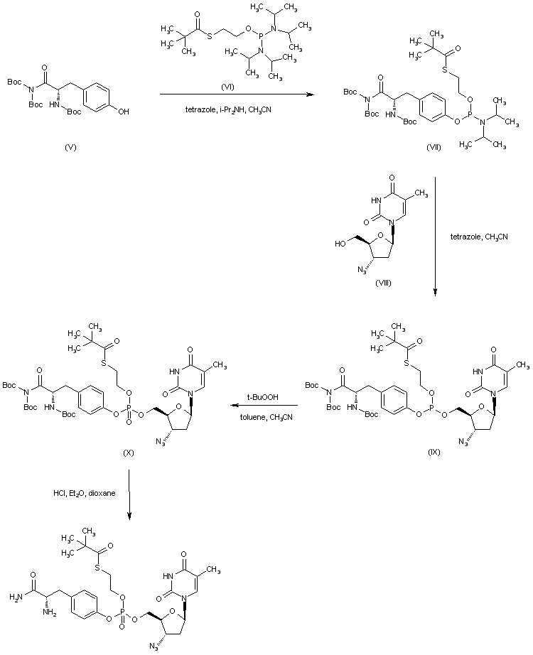 Tetrazole-catalyzed phosphitylation of the tyrosinamide derivative (V) with O-2-(pivaloylthio)ethyl-N,N,N',N'-tetraisopropylphosphorodiamidite (VI) yields phosphoramidite (VII). This is subsequently coupled to azidothimidine (VIII) to furnish phosphite (IX), which is then oxidized to the corresponding phosphate (X) with t-butyl hydroperoxide. The N-Boc protecting groups of (X) are finally removed under acidic conditions to provide the title compound.