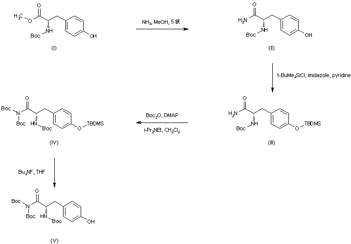 N-Boc-L-Tyrosine (I) methyl ester is treated with methanolic ammonia to provide amide (II). Protection of the phenolic hydroxyl of (II) with t-butyldimethylsilyl chloride leads to the silyl ether (III), which is further reacted with di-t-butyl dicarbonate in the presence of DMAP to furnish the tri-Boc derivative (IV). Subsequent desilylation of (IV) by means of tetrabutylammonium fluoride affords the tri-Boc-tyrosinamide (V).